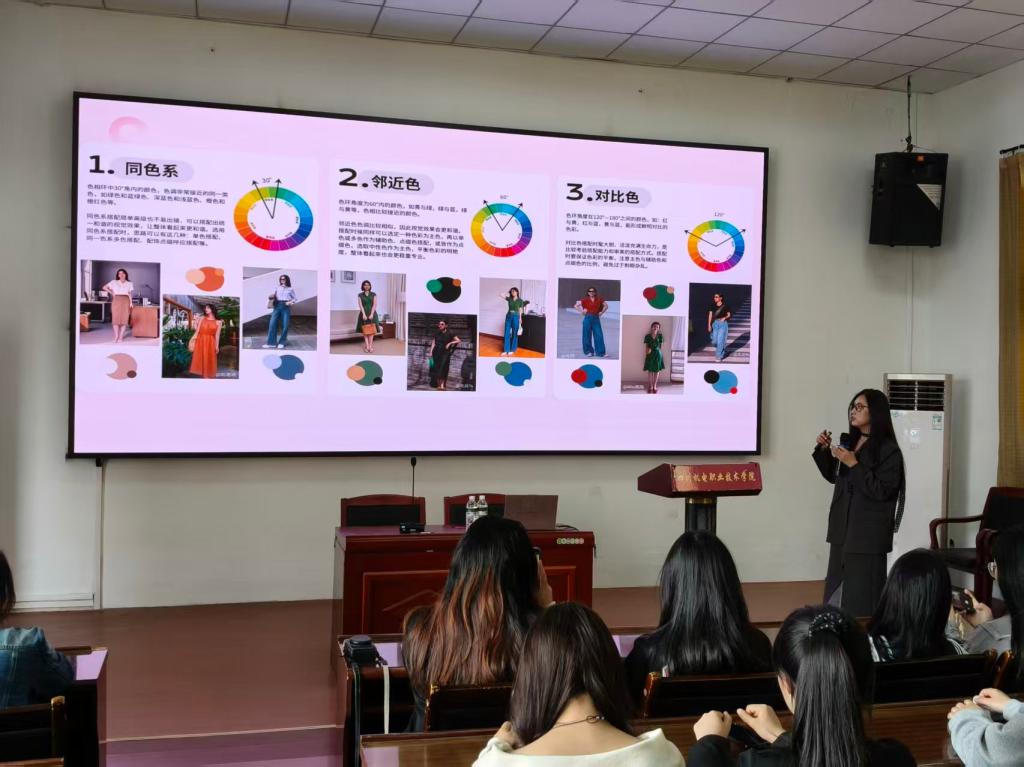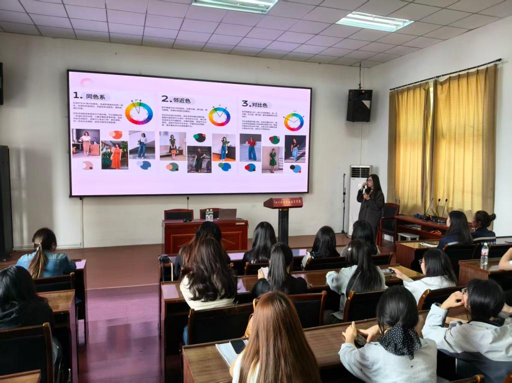 讲座在轻松愉悦的氛围中开启。主讲人海燕老师从“学生党”的日常场景出发,讲解内容务实而生动。在化妆部分,她重点讲解了清洁护肤、自然通透的日常妆容步骤,强调了“扬长避短、自然为美”的理念。在穿搭环节,海燕老师结合不同身形特点,解析了色彩搭配、款式选择的基本原则,并分享了如何利用有限的单品,通过巧思搭配出多样风格,兼顾校园生活的舒适与得体。